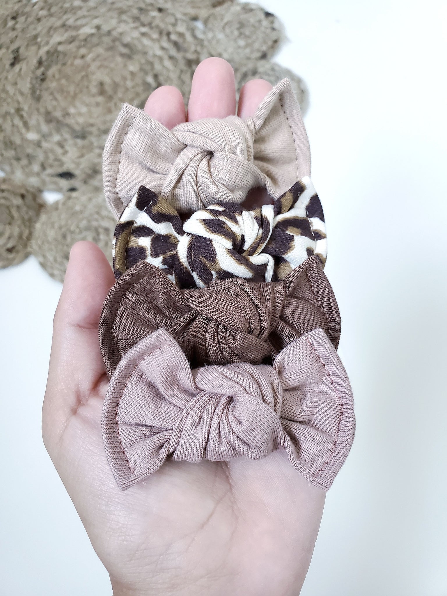A set of 4 Mila bows curated by designer Em from @ushappyfour. Colours are as pictured. You get to choose your style: clips or nylon headbands!