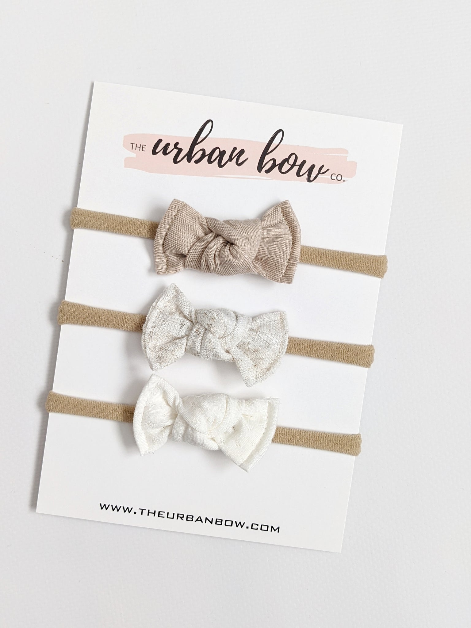 A set of 3 Mini bows. Colours are as pictured. You get to choose your style: clips or nylon headbands!