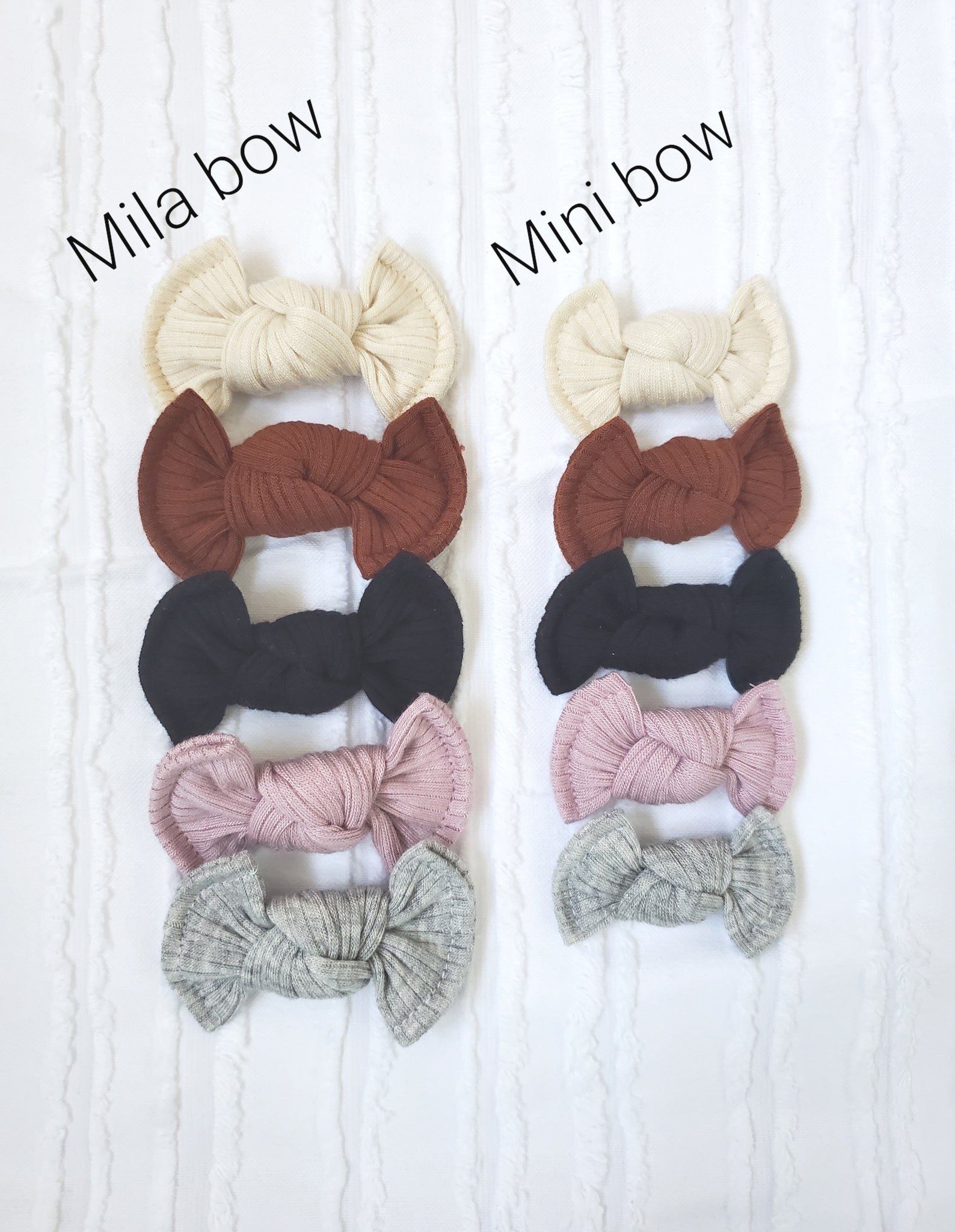Our Mila bows are the larger version of our mini bows. They can come as a clip, nylon headband or ponytail! The clips are set on alligator clips. You can also add clip grip to your clips if your babe's hair is very fine (not available for headbands). It is a rubber that helps hold the hair in place. The headbands are set on black or tan nylon headbands and are one size fits all. The ponytails are black and come as a hard elastic band or a soft elastic band.