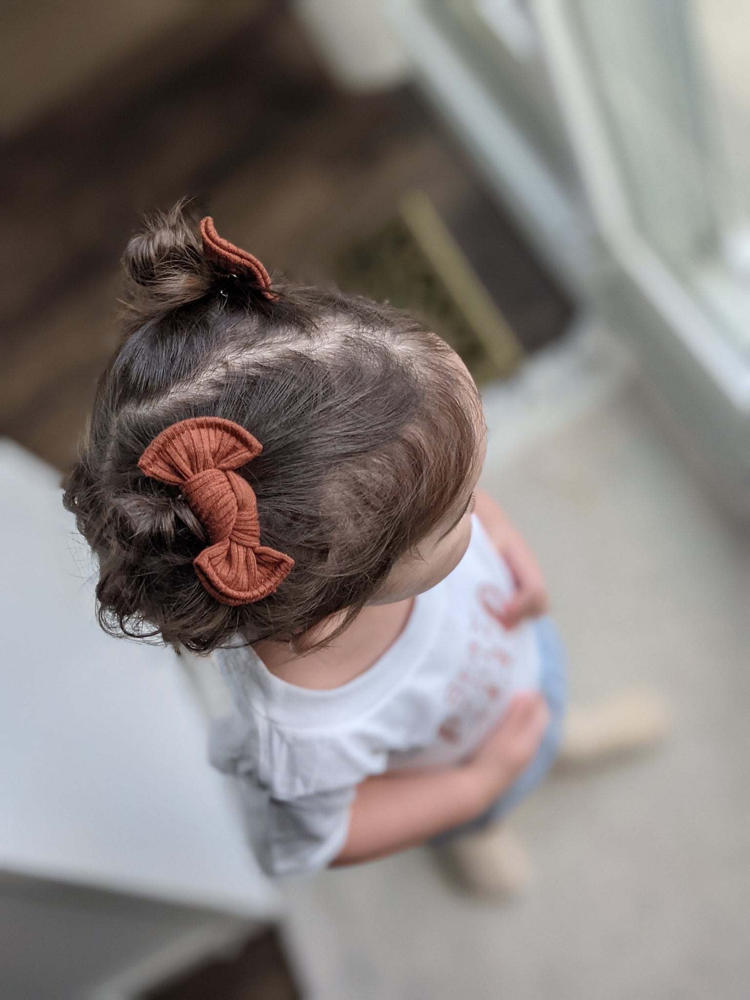 Our Mila bows are the larger version of our mini bows. They can come as a clip, nylon headband or ponytail! The clips are set on alligator clips. You can also add clip grip to your clips if your babe's hair is very fine (not available for headbands). It is a rubber that helps hold the hair in place. The headbands are set on black or tan nylon headbands and are one size fits all. The ponytails are black and come as a hard elastic band or a soft elastic band.