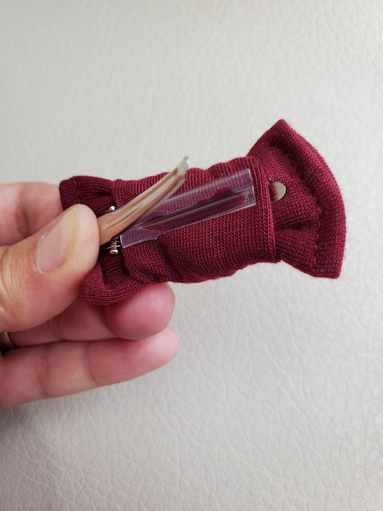 Our mini bows can come as a clip, nylon headband or ponytail! The clips are set on alligator clips. You can also add clip grip to your clips if your babe's hair is very fine (not available for headbands). It is a rubber that helps hold the hair in place. The headbands are set on black or tan nylon headbands and are one size fits all. The ponytails are black and come as a hard elastic band or a soft elastic band.